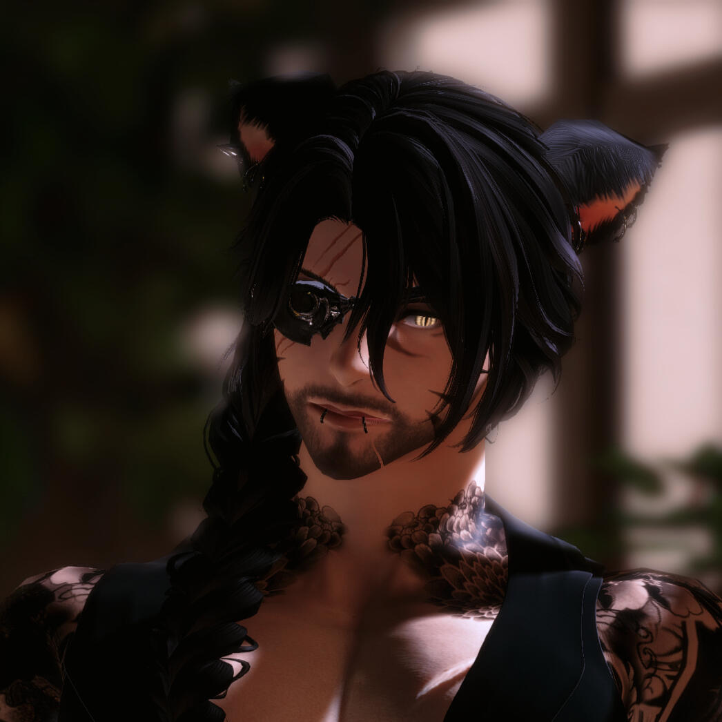 notable features. miqo'te markings, rough stubble, large fanged teeth, large spotted tail, floral/wave symmetrical tattoo (along his arms, base of his neck, and down his sides/partial back), piercings (ears, lower lip, chest, groin).