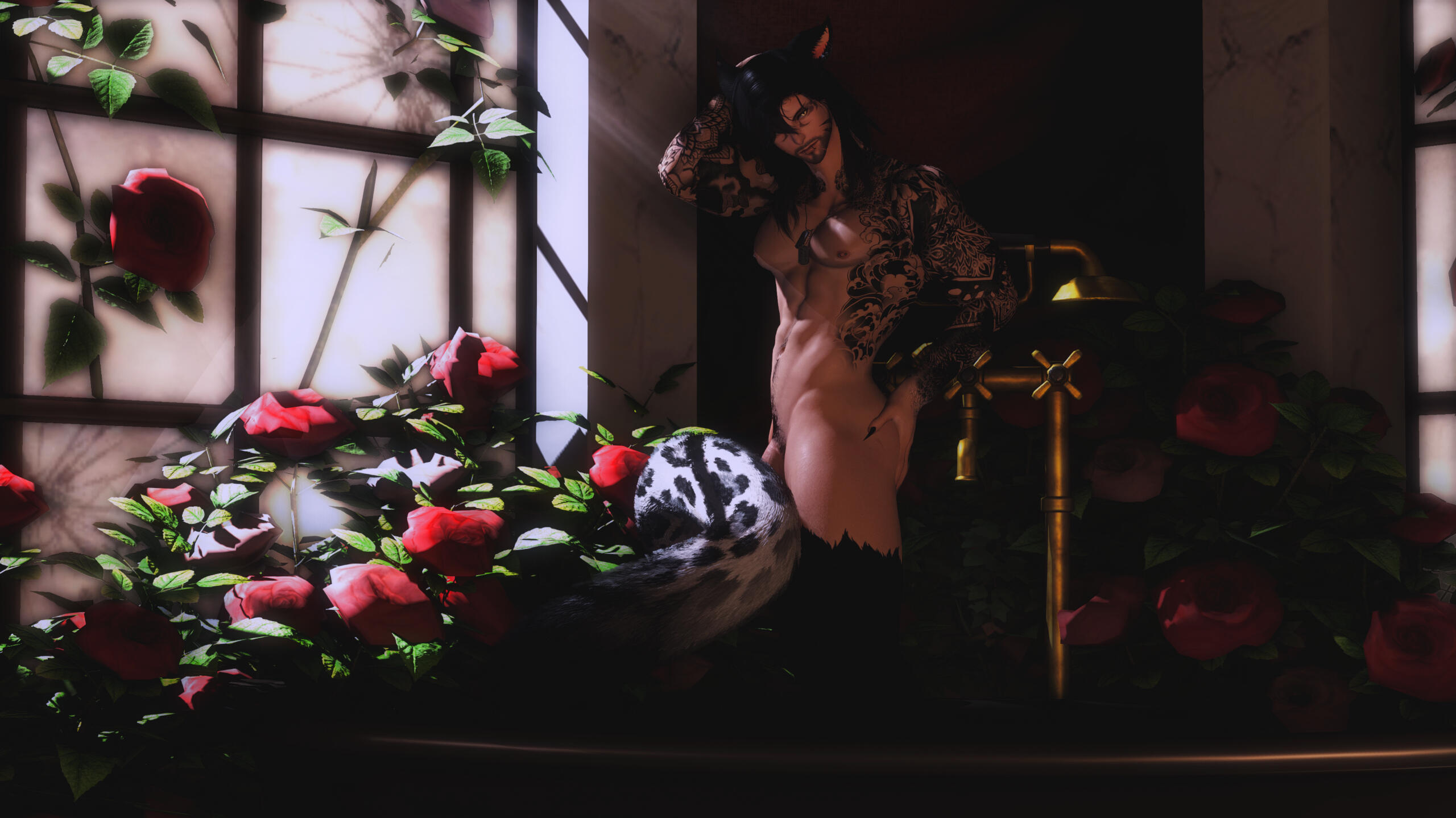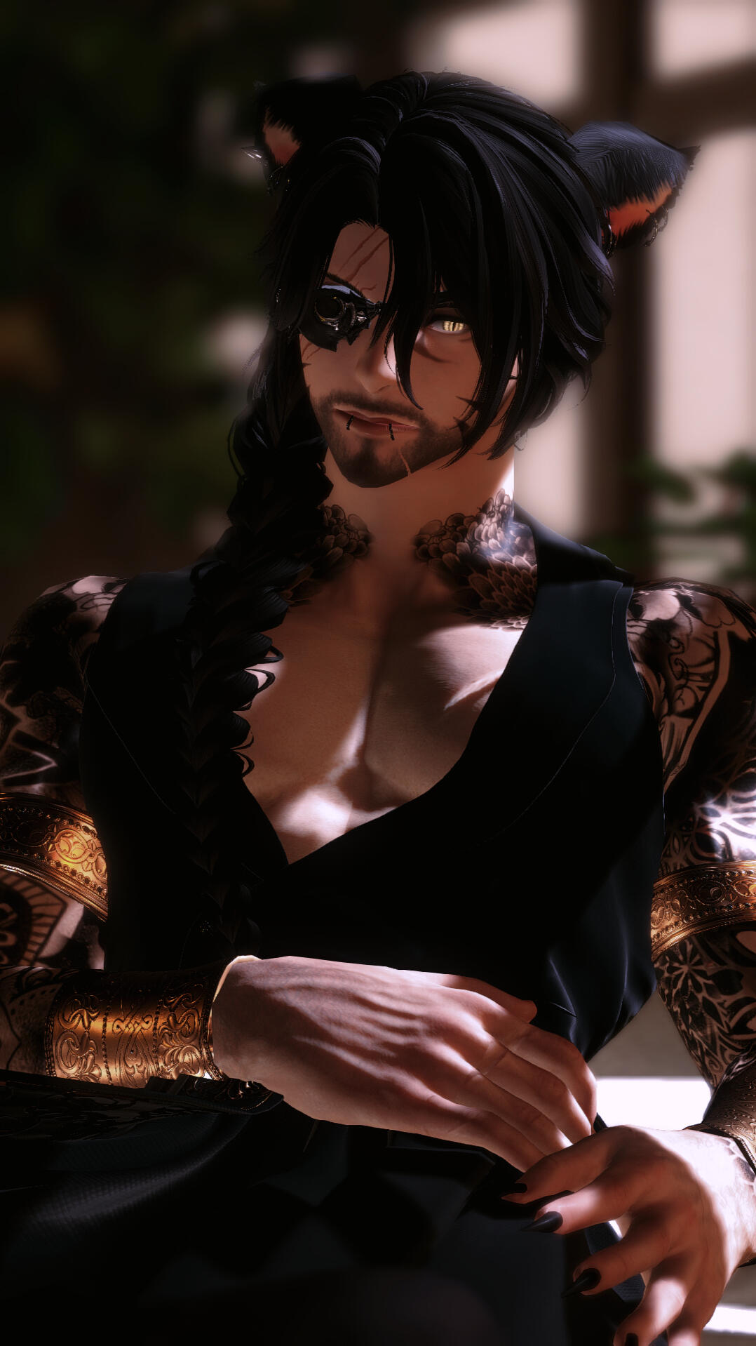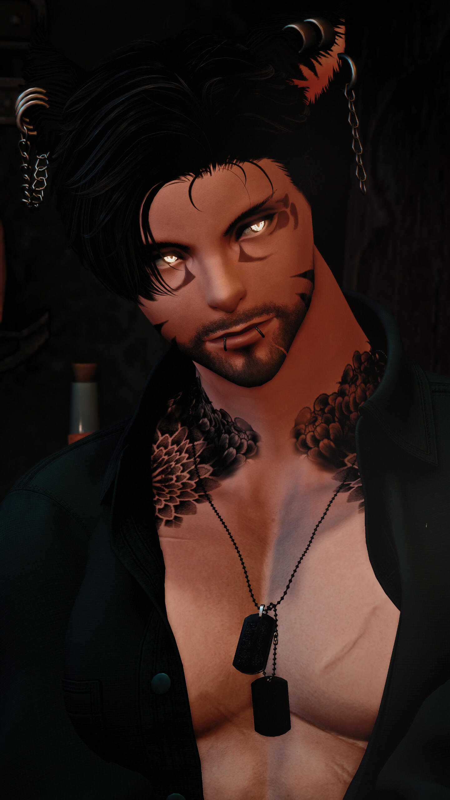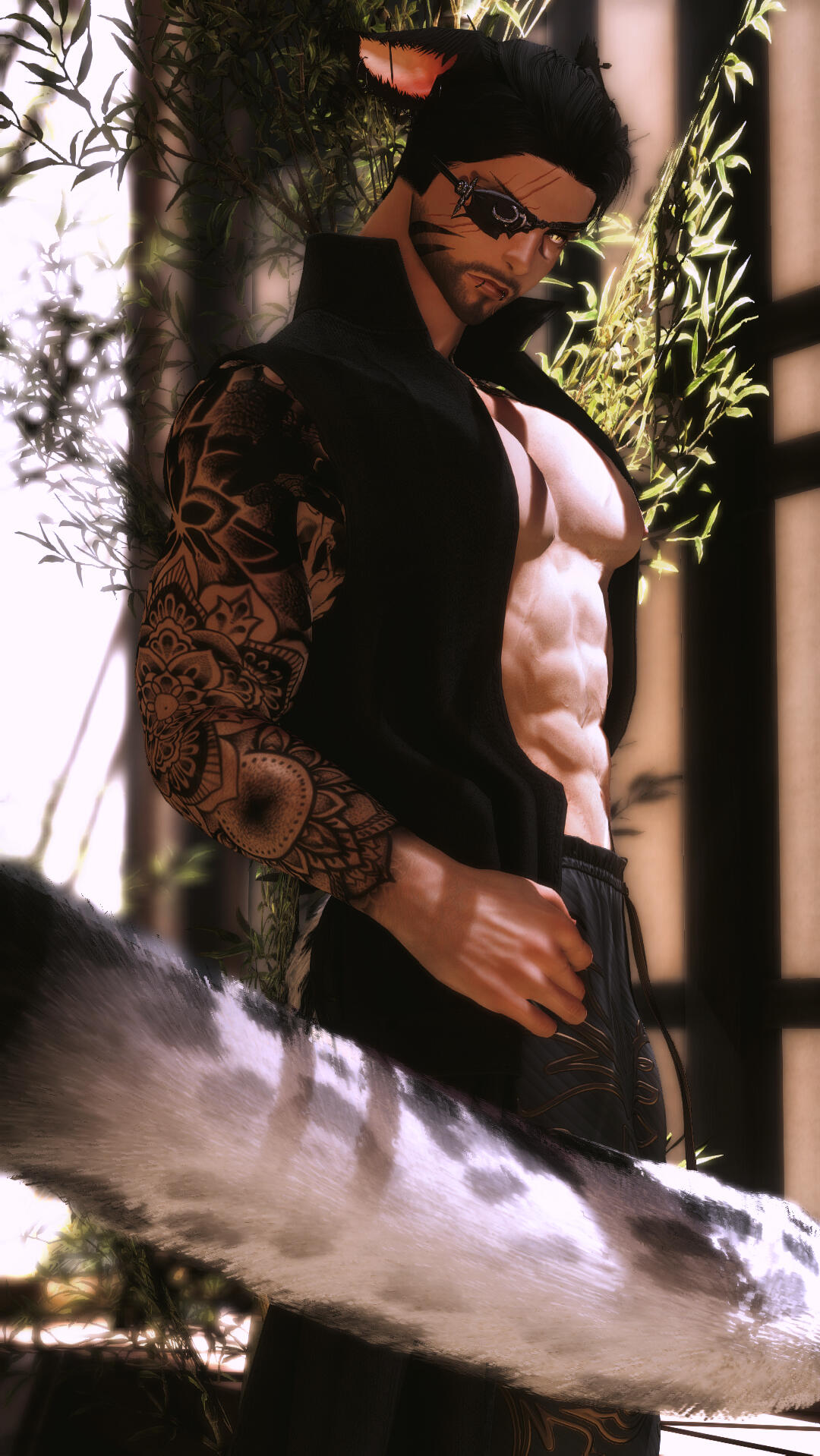 notable features. miqo'te markings, rough stubble, large fanged teeth, large spotted tail, floral/wave symmetrical tattoo (along his arms, base of his neck, and down his sides/partial back), piercings (ears, lower lip, chest, groin).