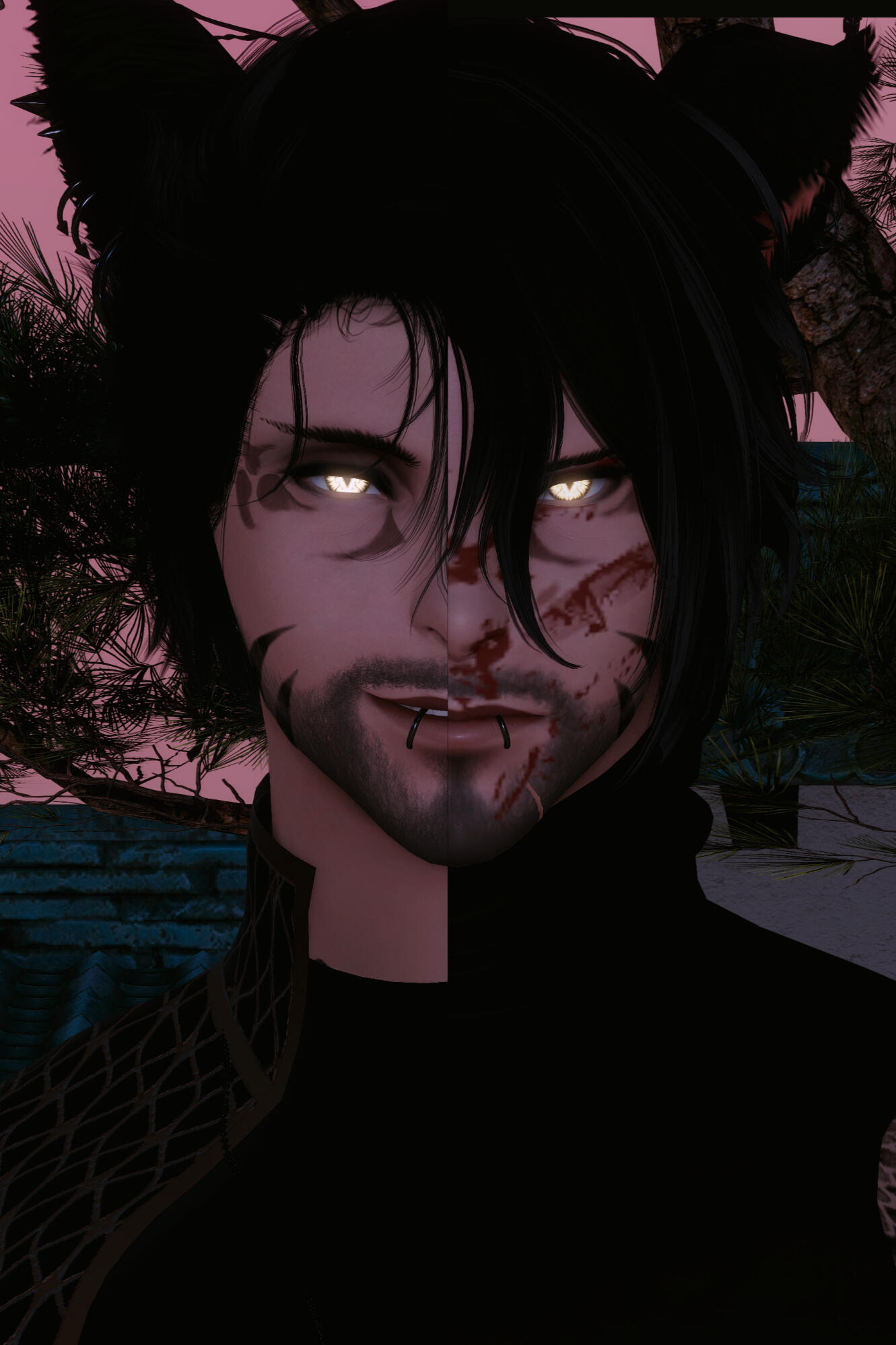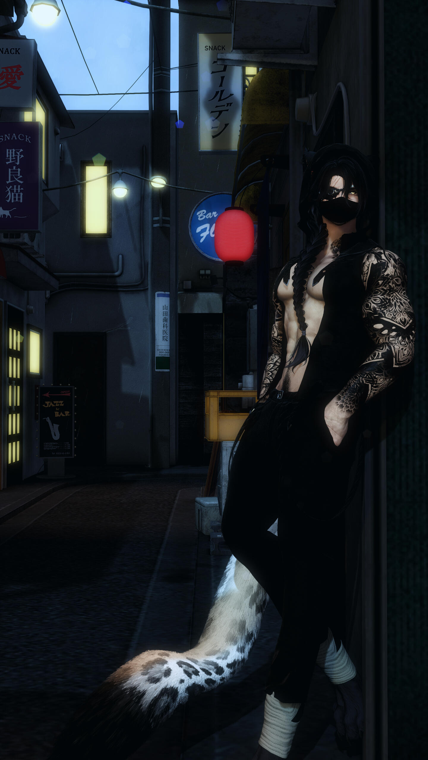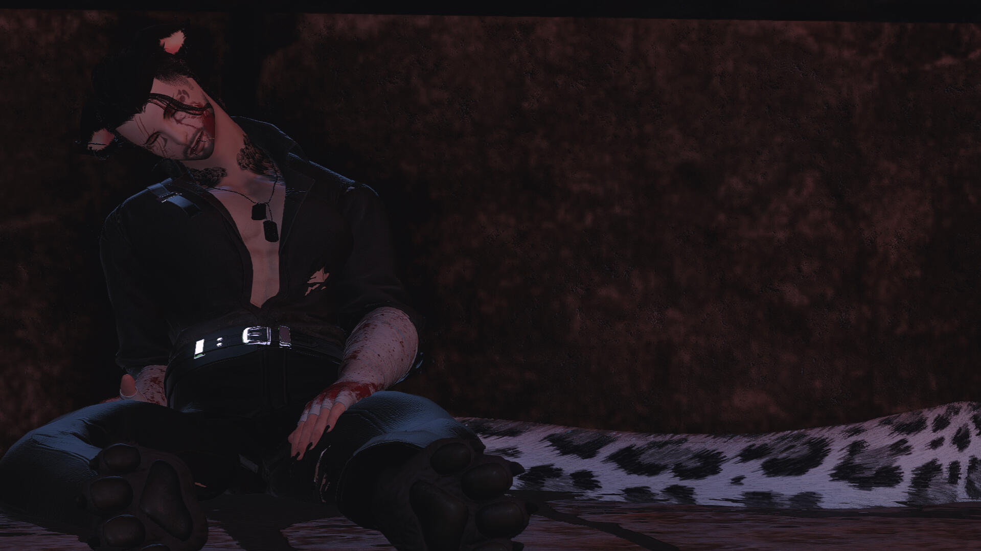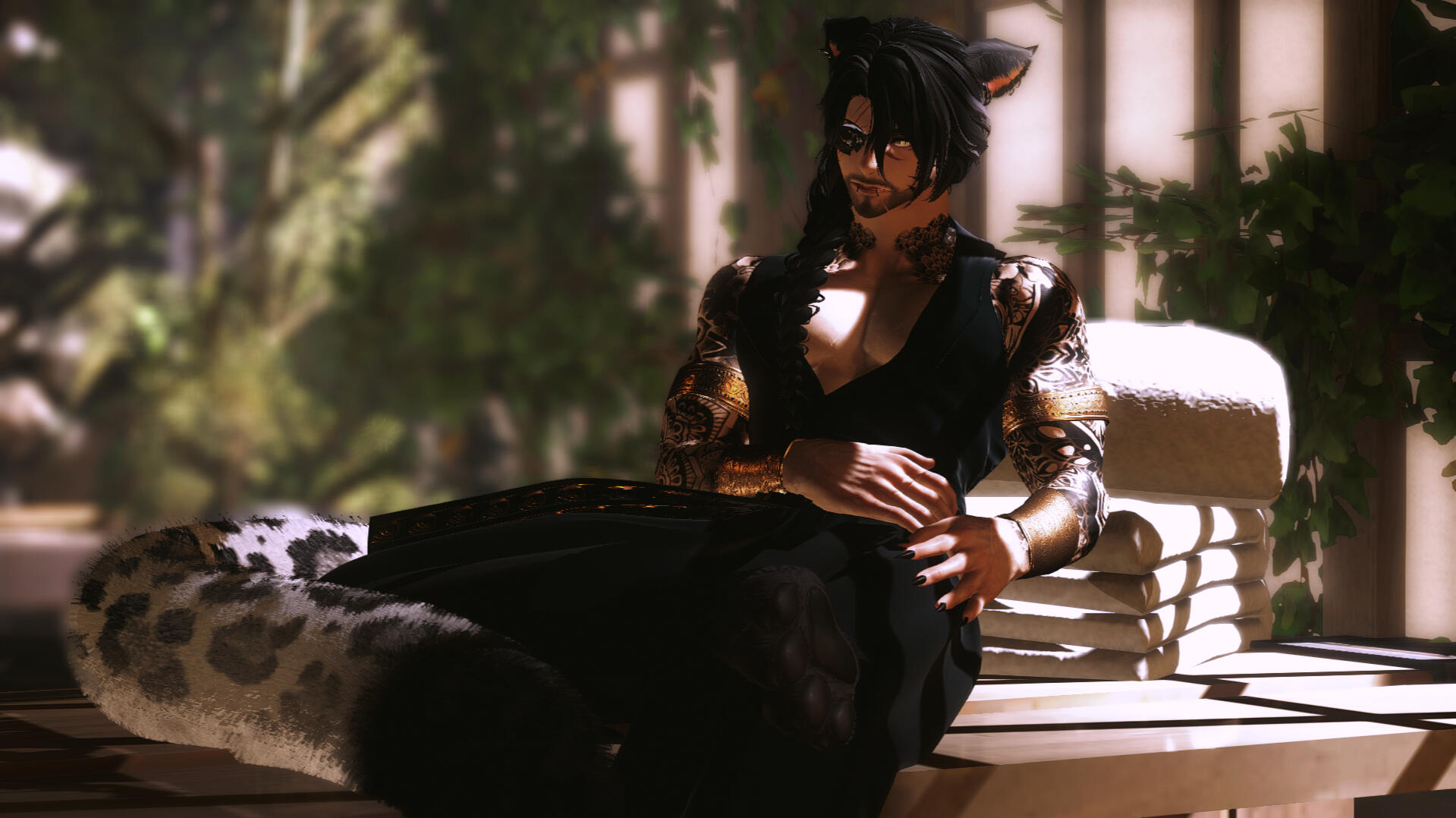 notable features. miqo'te markings, rough stubble, large fanged teeth, large spotted tail, floral/wave symmetrical tattoo (along his arms, base of his neck, and down his sides/partial back), piercings (ears, lower lip, chest, groin).