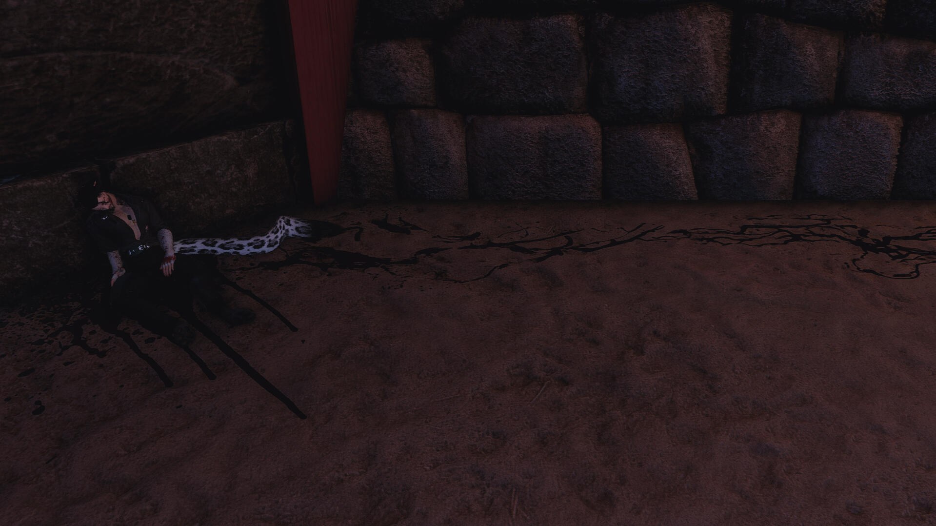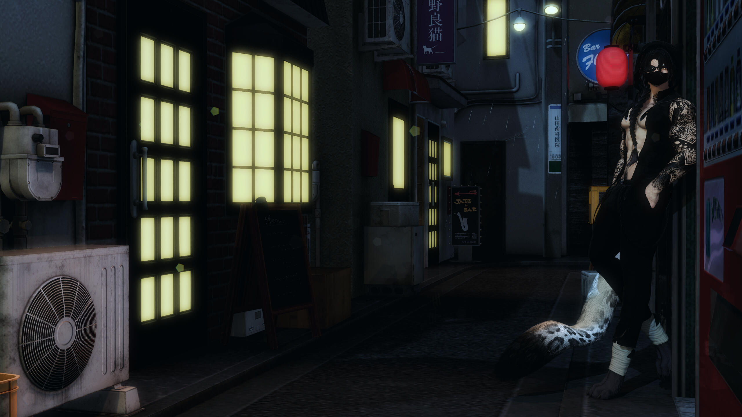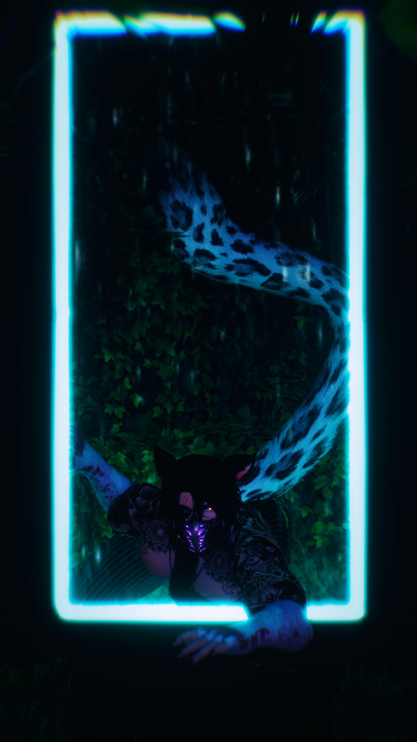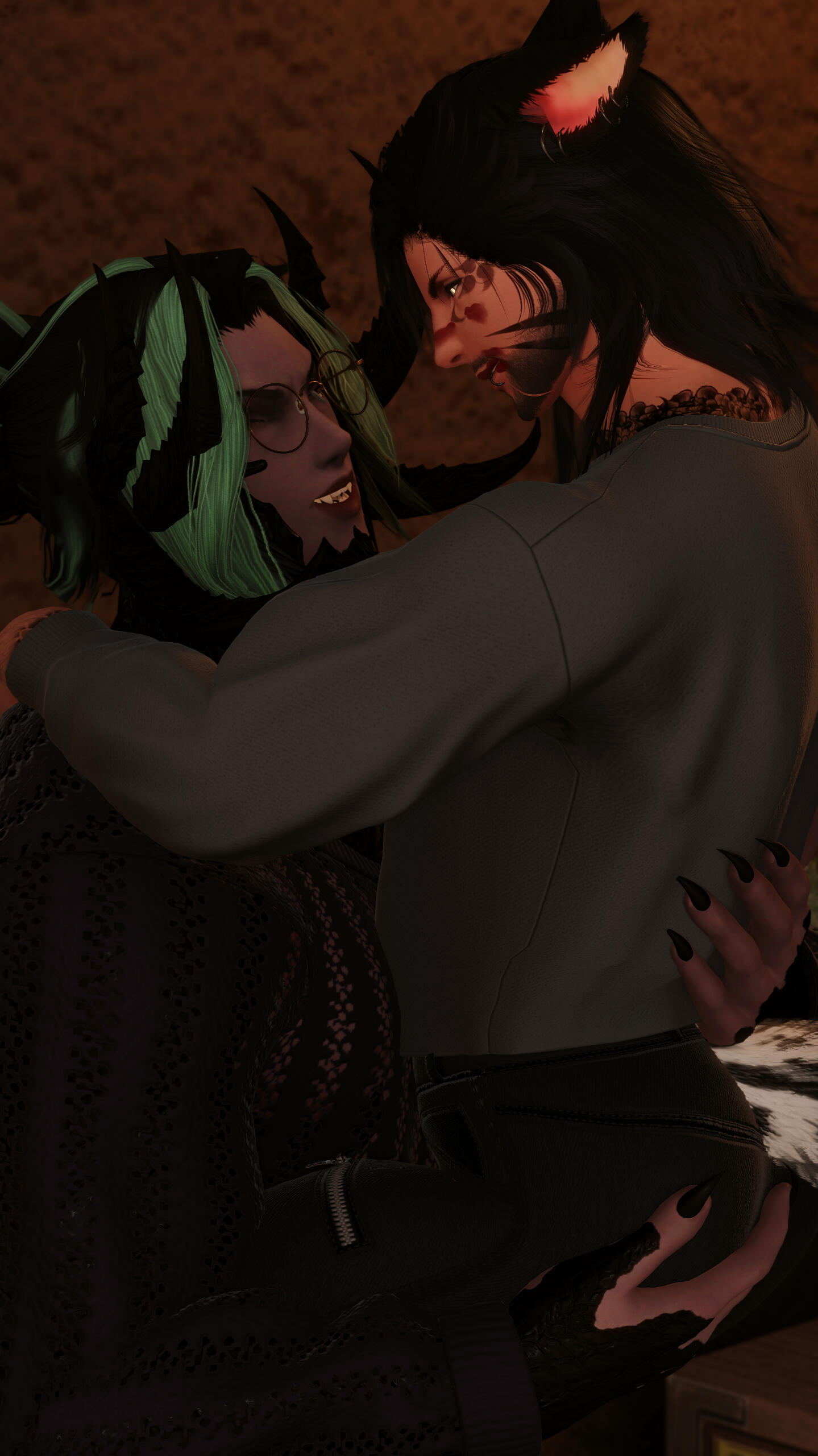 notable features. miqo'te markings, rough stubble, large fanged teeth, large spotted tail, floral/wave symmetrical tattoo (along his arms, base of his neck, and down his sides/partial back), piercings (ears, lower lip, chest, groin).